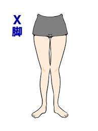 X脚とは文字どおり、脚がXの形に変形することです。太ももとヒザはくっつきますが、ふくらはぎと内くるぶしはくっつかず離れていて、正面から見ると、Xの形をしています。